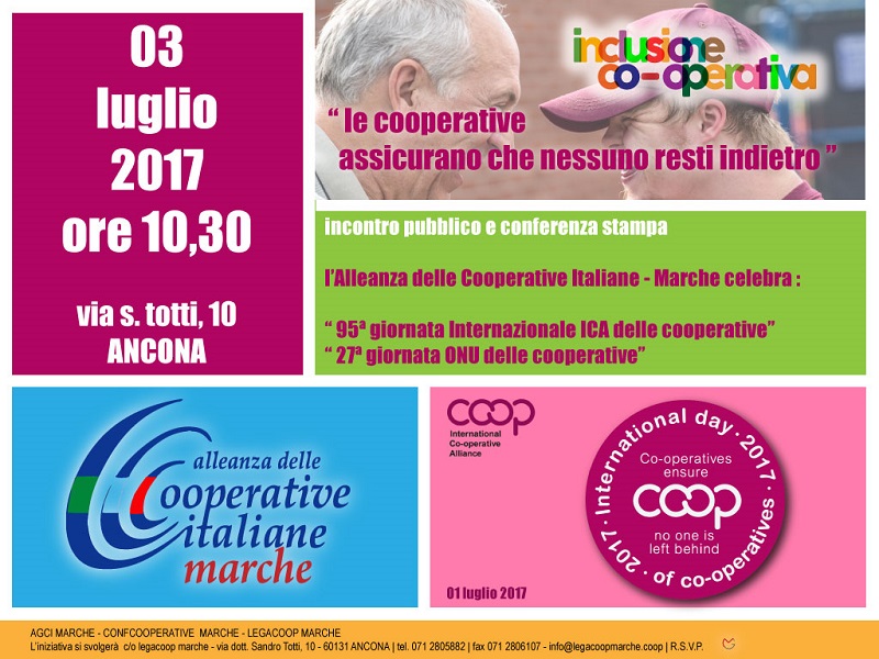 "Le cooperative non lasciano indietro nessuno". E' l'inclusione il tema della Giornata internazionale delle cooperative che l'Alleanza delle Cooperative Italiane celebra a livello nazionale e regionale. Nelle Marche, l'Aci organizza lunedì 3 luglio alle 10.30, nella sede di Legacoop Marche ad Ancona, un incontro pubblico, cui seguirà una conferenza stampa, alle 11.30, sul valore e sulle motivazioni della Giornata e della cooperazione come modello per combattere l'esclusione sociale e la diseguaglianza.