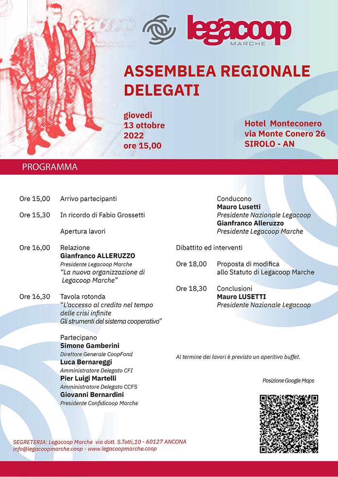 Dopo la proposta di modifica dello statuto di Legacoop Marche, il presidente di Legacoop nazionale, Mauro Lusetti, chiuderà l’assemblea regionale dei delegati di Legacoop Marche.