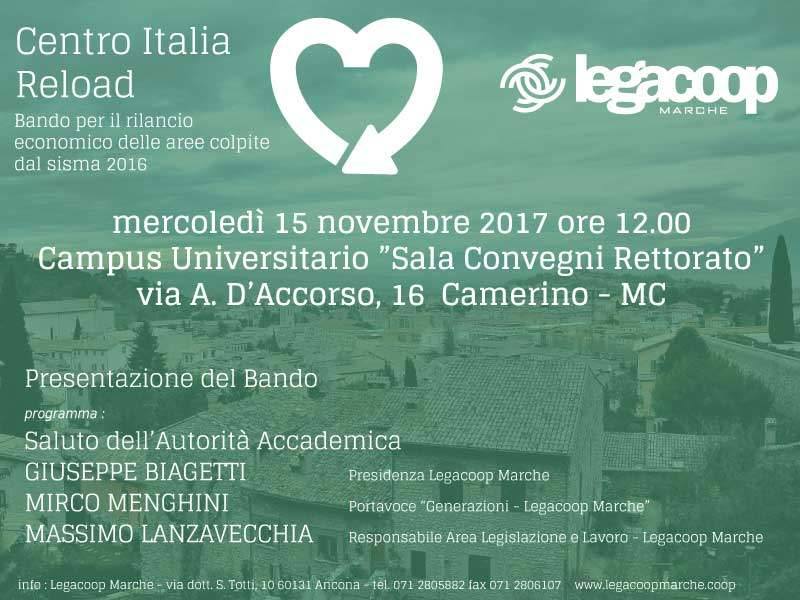 Mercoledì 15 novembre, alle 12 nella Sala convegni del Rettorato dell'Università di Camerino, al Campus universitario di Camerino (via A. D'Accorso 16), si svolgerà la conferenza stampa di presentazione del bando Legacoop "Centro Italia Reload" per il rilancio economico delle aree colpite dal terremoto del 2016.