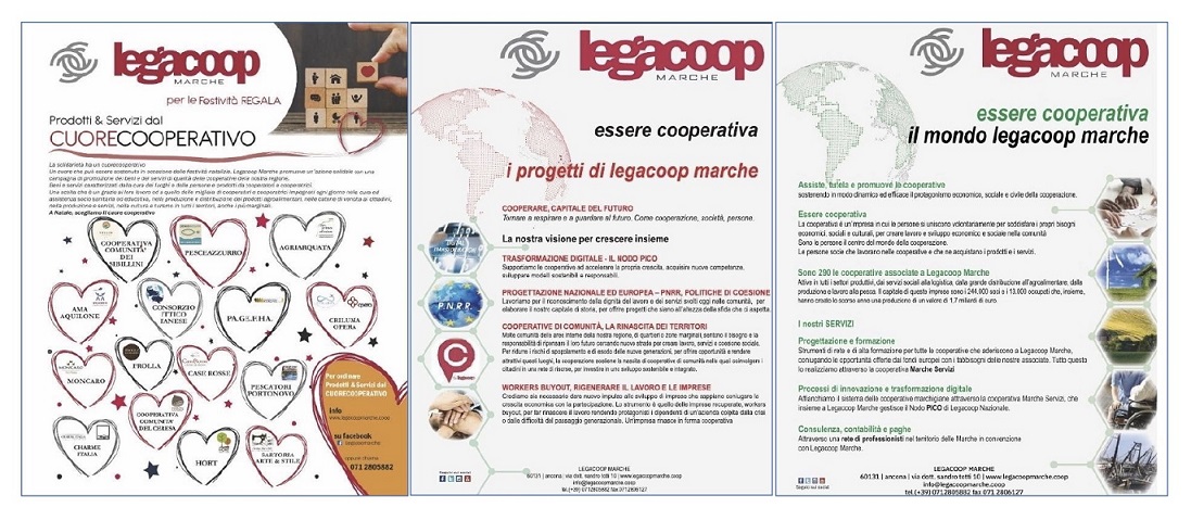 Legacoop Marche ha presentato il mondo cooperativo con una campagna di comunicazione attraverso le pagine regionali dei due quotidiani marchigiani di riferimento: Corriere Adriatico e Il Resto del Carlino. Un mondo, quello di Legacoop Marche, che associa 290 cooperative, con un capitale di 244 mila soci e 13 mila occupati e un valore di produzione 2020 di 1,7 miliardi di euro.