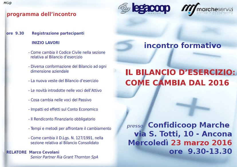"Il bilancio d'esercizio: come cambia dal 2016": sarà questo il tema dell'incontro formativo organizzato da Legacoop Marche e da Marche Servizi, che si svolgerà mercoledì 23 marzo, dalle 9.30 alle 13.30 nella sede di Confidicoop Marche ad Ancona.