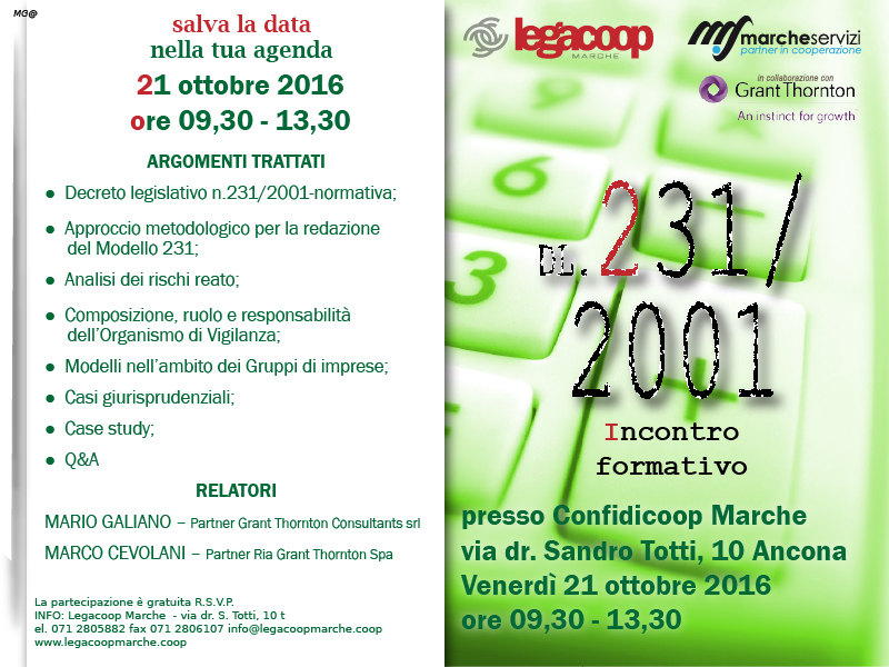 Si svolgerà venerdì 21 ottobre il seminario di formazione sulla responsabilità amministrativa delle società e degli enti organizzato da Legacoop Marche e Marche Servizi, in collaborazione con Grant Thornton. La giornata formativa si terrà ad Ancona nella Sala riunioni di Confidicoop Marche. Relatori saranno Mario Galiano e Marco Cevolani di Grant Thornton.