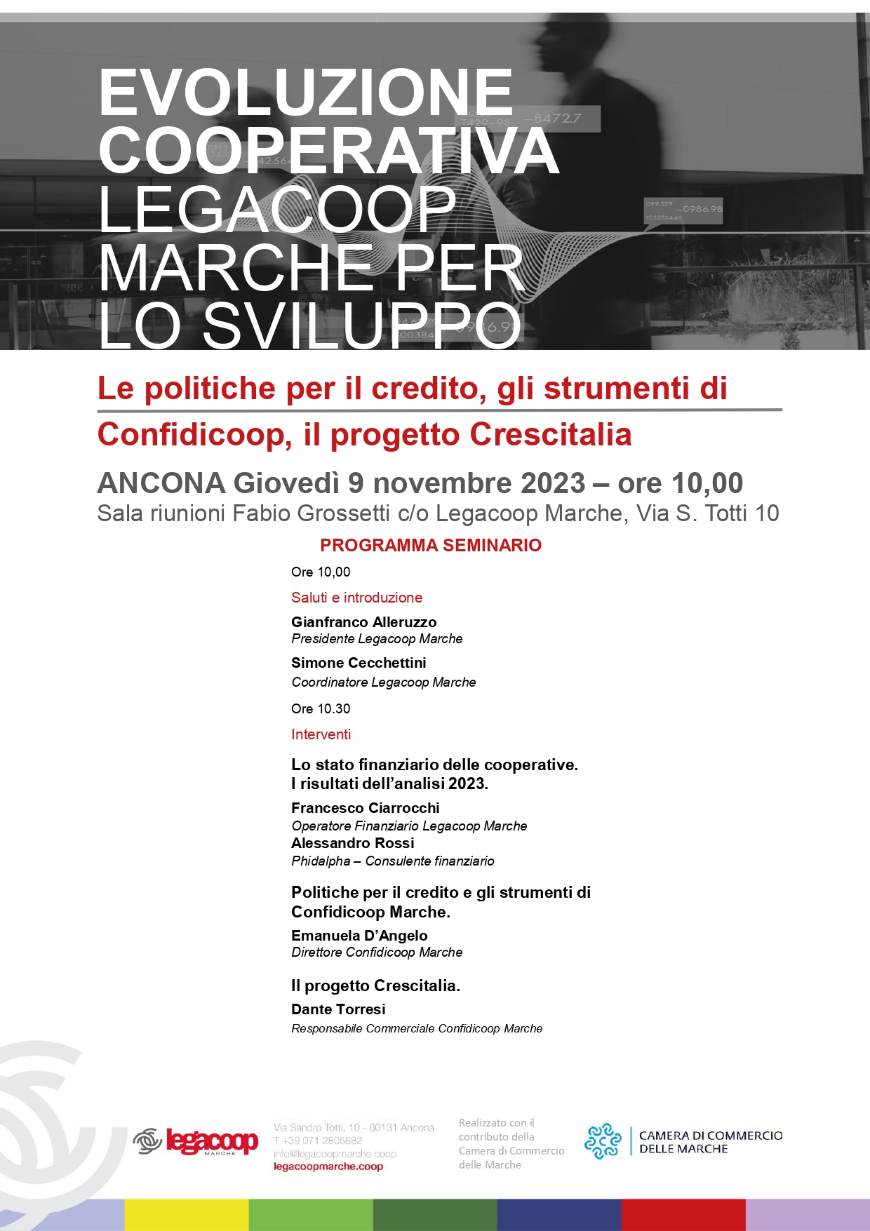 Legacoop Marche organizza il seminario “Le politiche per il credito, gli strumenti di Confidicoop, il progetto Crescitalia”, che si svolgerà giovedì 9 novembre alle 10 nella Sala riunioni Fabio Grossetti nella sede dell’associazione ad Ancona. L’iniziativa è parte del progetto “Evoluzione cooperativa. Legacoop Marche per lo sviluppo”, realizzato con il contributo della Camera di Commercio delle Marche.