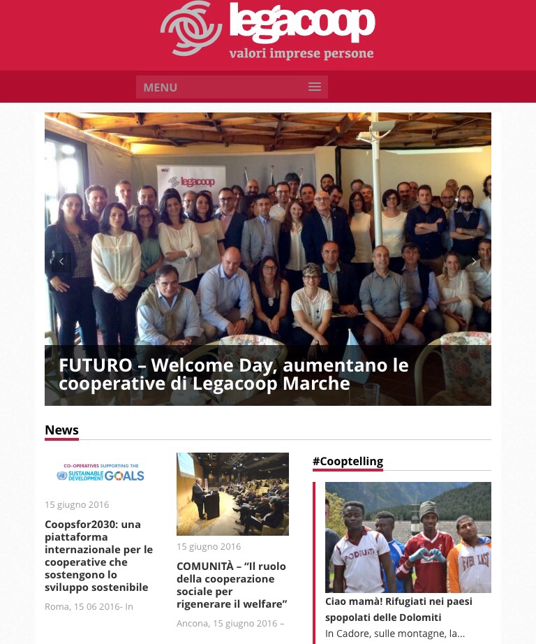 Primo piano, sulla home del sito di Legacoop, per il Welcome Day, organizzato all’hotel Monteconero di Sirolo (An) per dare il benvenuto alle nuove cooperative che hanno aderito a Legacoop Marche. Il sito di Legacoop nazionale riprende anche la notizia dell’iniziativa sul welfare “La visione della cooperazione sociale", che si è svolta al Ridotto del Teatro delle Muse e a cui ha partecipato il ministro del Lavoro e delle Politiche sociali, Giuliano Poletti.