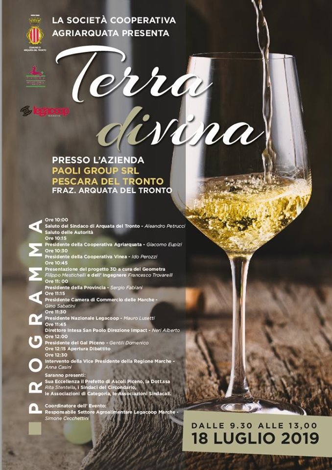 Alla presentazione “Terra divina”, coordinata da Simone Cecchettini, responsabile Agroalimentare Legacoop Marche, dopo i saluti del sindaco di Arquata del Tronto, Aleandro Petrucci, interverranno Giacomo Eupizi, presidente Agriarquata, Ido Perozzi, presidente cooperativa Vinea, Gino Sabatini, presidente della Camera di Commercio delle Marche, Mauro Lusetti, presidente nazionale Legacoop, e Anna Casini, vicepresidente Regione Marche. Parteciperanno all’incontro Filippo Mestichelli e Francesco Trovarelli per la presentazione del progetto 3D, Sergio Fabiani, presidente della Provincia di Ascoli Piceno, Alberto Neri, direttore Intesa San Paolo direzione Impact, Domenico Gentili, presidente Gal Piceno, con Rita Stentella, prefetto di Ascoli Piceno, i sindaci del territorio, le associazioni di categoria e sindacali.