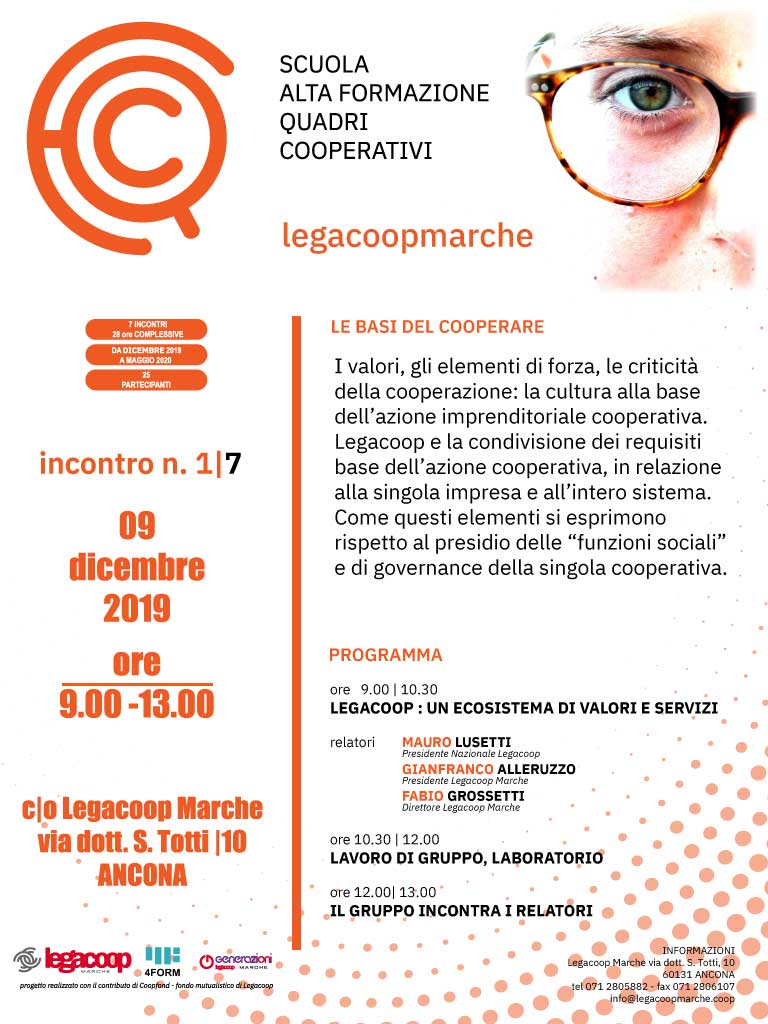 Un percorso per approfondire cosa vuol dire essere un cooperatore. Inizia la seconda annualità della Scuola di alta formazione per dirigenti cooperativi, un progetto voluto da Legacoop Marche e Generazioni Marche, in collaborazione con 4Form, l’ente di formazione nazionale di Legacoop. Il primo incontro, dedicato a “Legacoop: un sistema di valori e servizi”, si svolgerà lunedì 09 dicembre, dalle 9 alle 13, nella sede di Legacoop Marche ad Ancona con gli interventi di Mauro Lusetti, presidente nazionale Legacoop, Gianfranco Alleruzzo e Fabio Grossetti, presidente e direttore di Legacoop Marche.