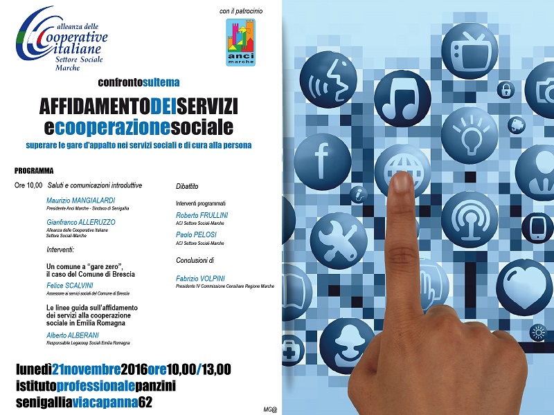 Affidamento dei servizi e cooperazione sociale: sarà questo il tema del confronto organizzato dall’Alleanza delle Cooperative Italiane settore Sociali Marche, con il patrocinio di Anci Marche, lunedì 21 novembre alle 10 all’Istituto professionale Panzini di Senigallia (An). L’incontro avrà lo scopo di definire una strategia per poter superare le gare d’appalto nei servizi sociali e di cura alla persona per arrivare ad una coprogettazione dei servizi di welfare o di un sistema di accreditamento dei servizi socio sanitari, sociali ed educativi per garantire all’utenza servizi di qualità, sostenibili e omogenei sul territorio regionale.
