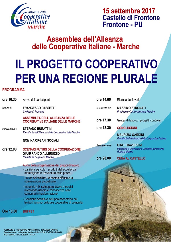 Seguirà l’avvio della progettazione dei gruppi di lavoro. I temi da condividere saranno: la filiera agricola, i prodotti dell’eccellenza marchigiana e l’avventura della pesca; le reti del welfare, le risorse diffuse e la rigenerazione progettuale; industria 4.0, sviluppare lavoro e servizi integrando risorse e conoscenza nelle comunità in trasformazione; coesione sociale e sviluppo economico nei territori, turismo, cultura e cooperative di comunità. Alle 14, parlerà Massimo Stronati, presidente di Confcooperative Marche, a cui seguiranno i report dei gruppi di lavoro. All’assemblea interverrà Gino Traversini, presidente II commissione consigliare permanente Regione Marche. Alle 18.30, le conclusioni saranno affidate a Maurizio Gardini, presidente dell’Alleanza delle Cooperative Italiane.
