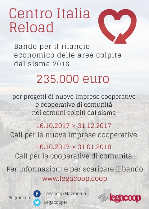 Nuove cooperative per far ripartire l’Italia centrale colpita dal sisma. Legacoop ha deciso di utilizzare 235 mila euro raccolti tra le associate per sostenere la nascita di nuove cooperative, di comunità ma non solo. Lo ha fatto attraverso il bando “Centro Italia Reload – rigenerare comunità nelle terre del Rinascimento Italiano” uscito oggi e riservato a nuove imprese nei 140 Comuni inseriti nel cratere sismico dell’Italia centrale.